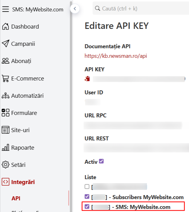 - Din ”Integrări > API”, editează API key-ul listei de abonați, bifează și lista de SMS nou creată și salvează.